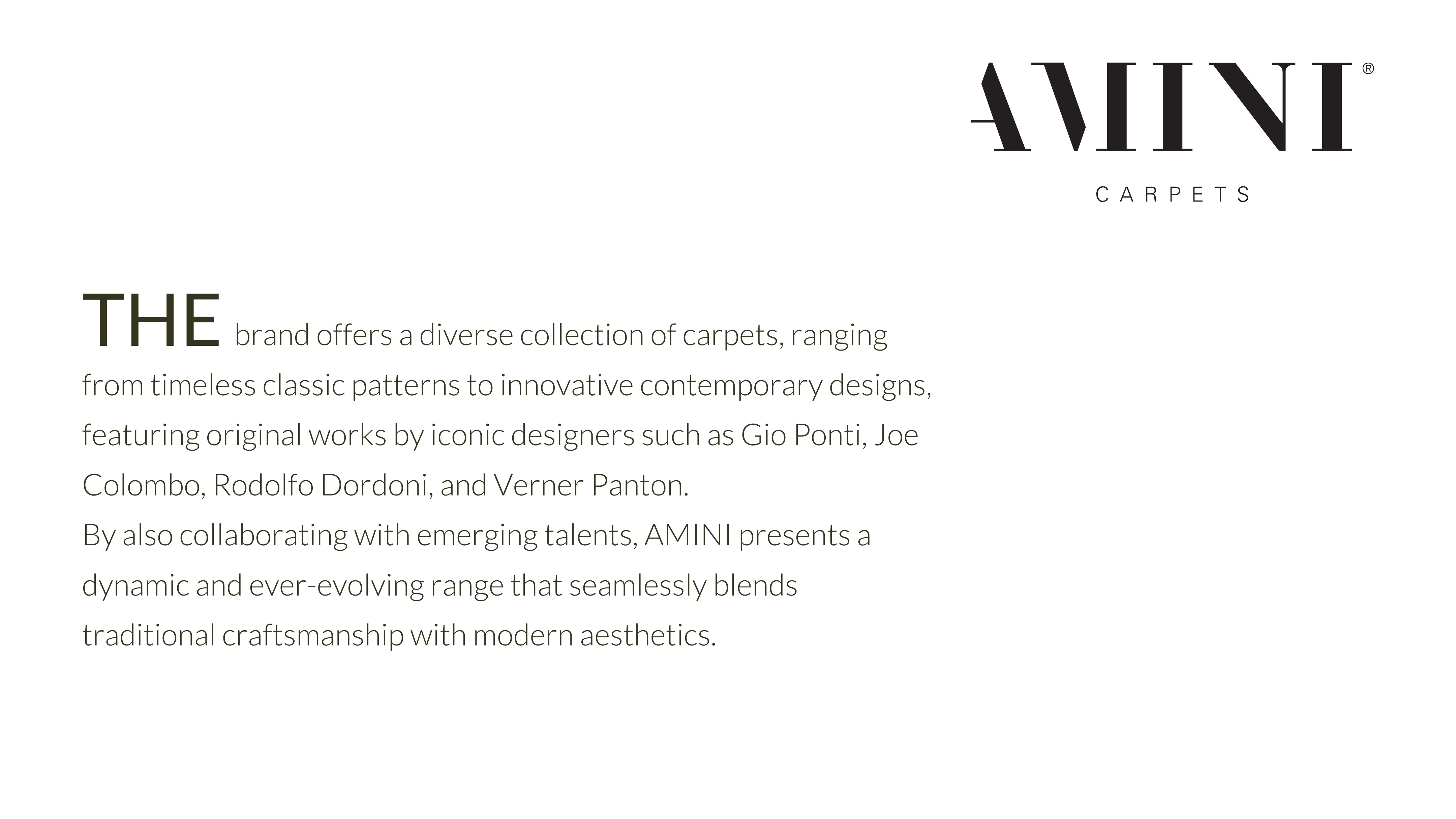 AMINI stands as a dynamic and forward-thinking entity in the world of interior design, distinguished by its unparalleled expertise in conceiving, producing, and marketing an extensive array of carpets. From artisanal masterpieces to precision-engineered creations, from contemporary designs to exclusive limited editions by renowned artists, from bespoke commissions to high-end industrial productions, AMINI seamlessly bridges tradition and innovation. With an impressive inventory of 750,000 square meters of carpets housed in its warehouses and over 3 million pieces managed annually from its expansive logistics hub south of Milan, the brand exemplifies an industrial vision rooted in craftsmanship. This synergy between heritage and efficiency enables a highly responsive, demand-driven production model, ensuring each batch meets the highest standards of quality and customization. Notably, bespoke creations now account for over 25% of AMINI’s total output, a testament to its commitment to tailored luxury and refined individuality.