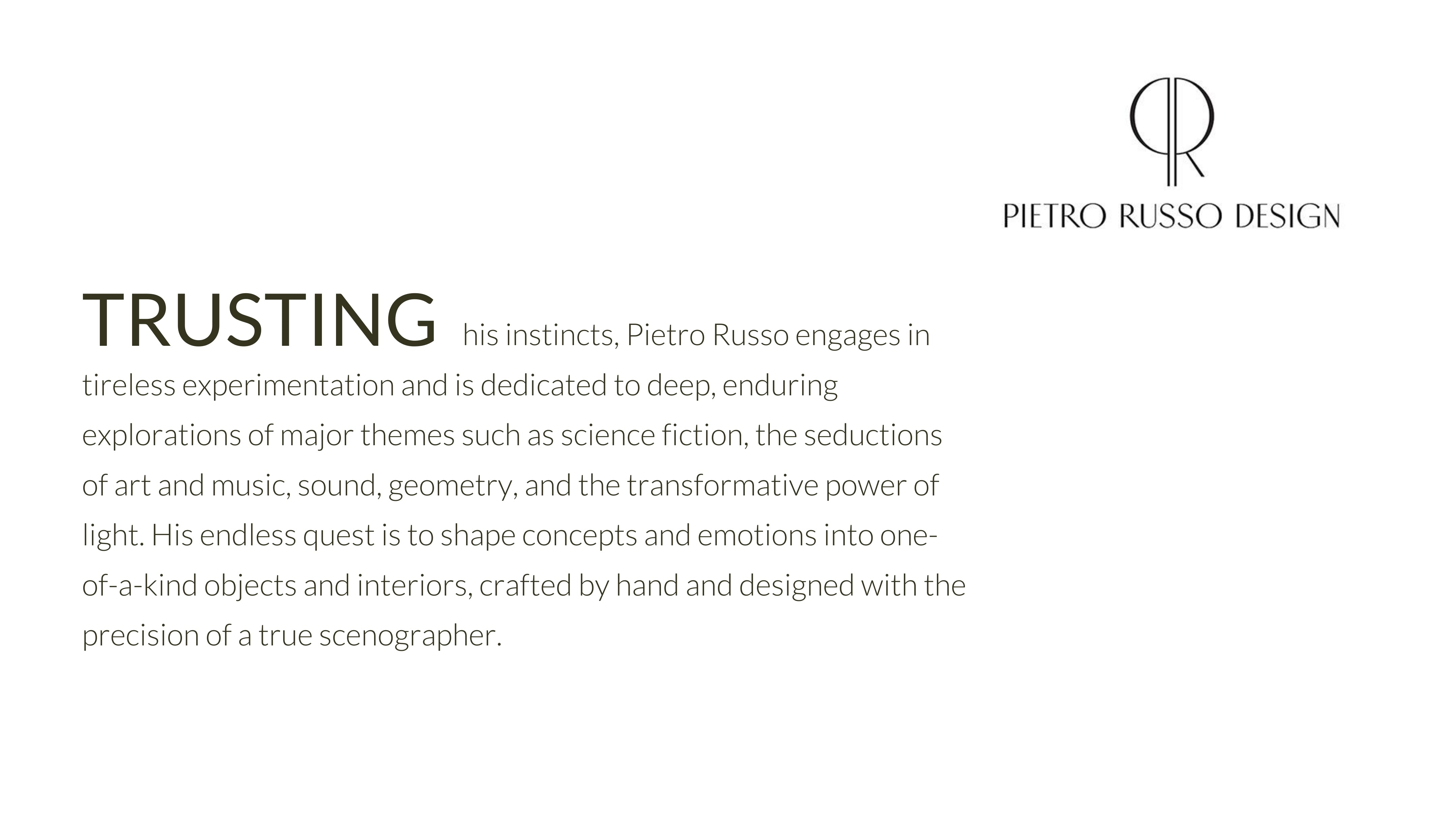 Pietro Russo began his artistic journey with training in painting and ceramics before enrolling at the Accademia di Belle Arti in Florence, where he specialized in scenography. His approach to design emerged as a research-driven exploration of existing scenic environments, eventually expanding into the realms of interior and product design.In 1997, Russo moved to Berlin, where he worked in film set and interior design while collaborating with various galleries to exhibit limited-edition objects. By 2001, he relocated to Milan and began a long-standing partnership with Lissoni Associati, contributing to product and interior design projects for renowned brands such as Alessi, Cappellini, Benetton, Kartell, Tecno Spa, and Kerakoll Design Gallery.In 2010, Russo established his own studio, focusing on interior and product design infused with his passion for scenographic spaces and a deep appreciation for traditional craftsmanship. His work is distinguished by its ability to create unique objects that respond to the character and story of each space. By observing artisans at work, Russo draws from timeless craft traditions and reinterprets them through his distinct design language.