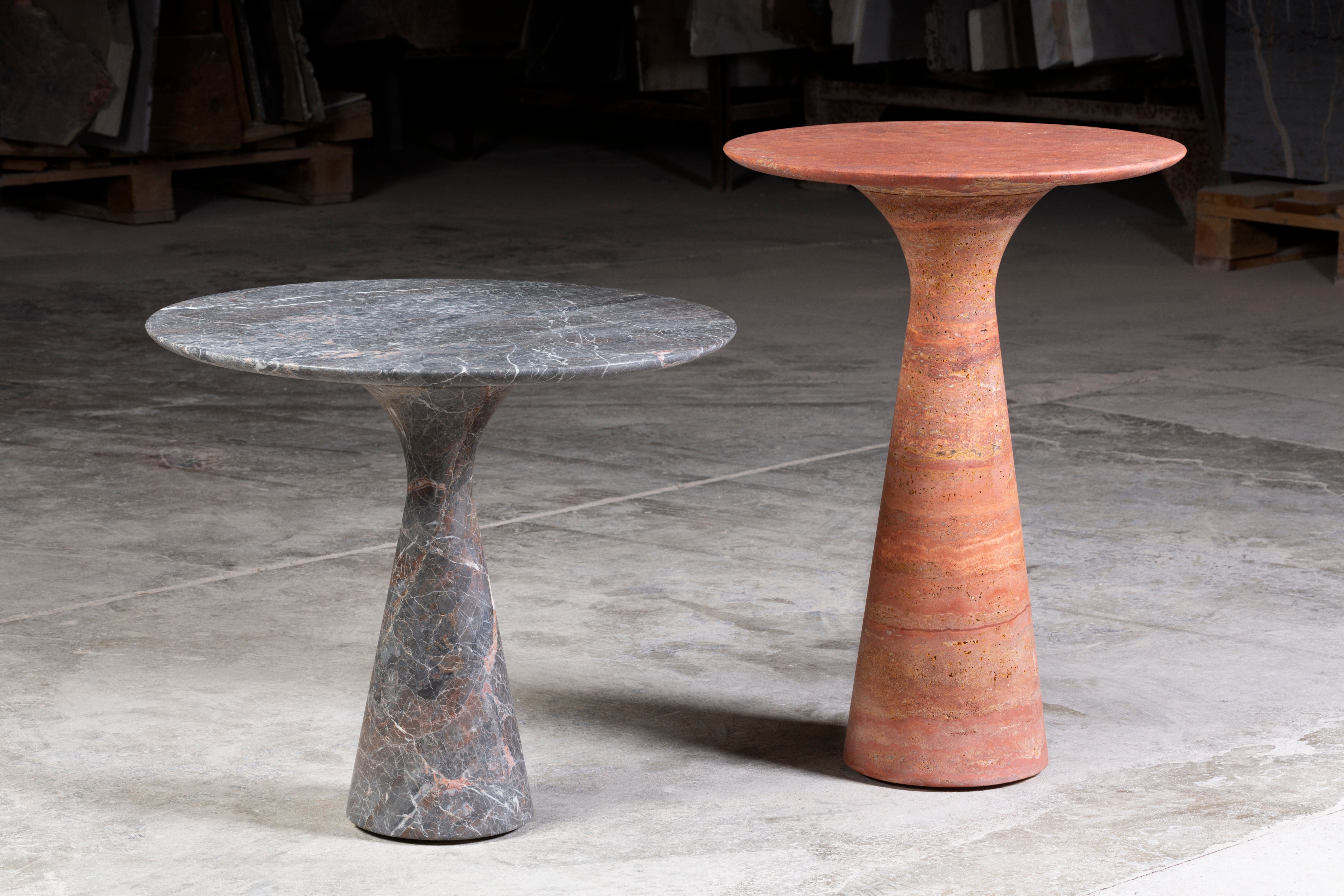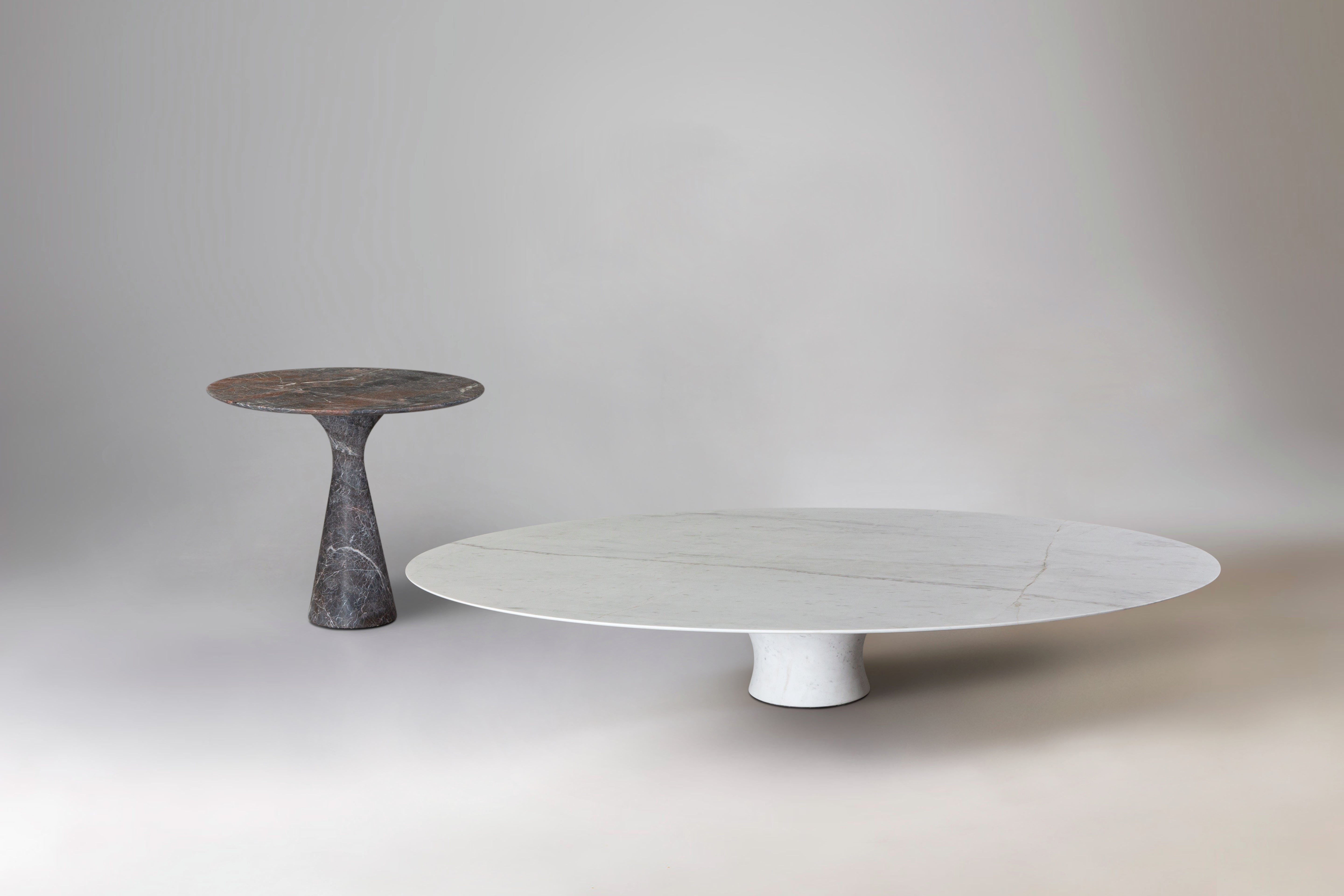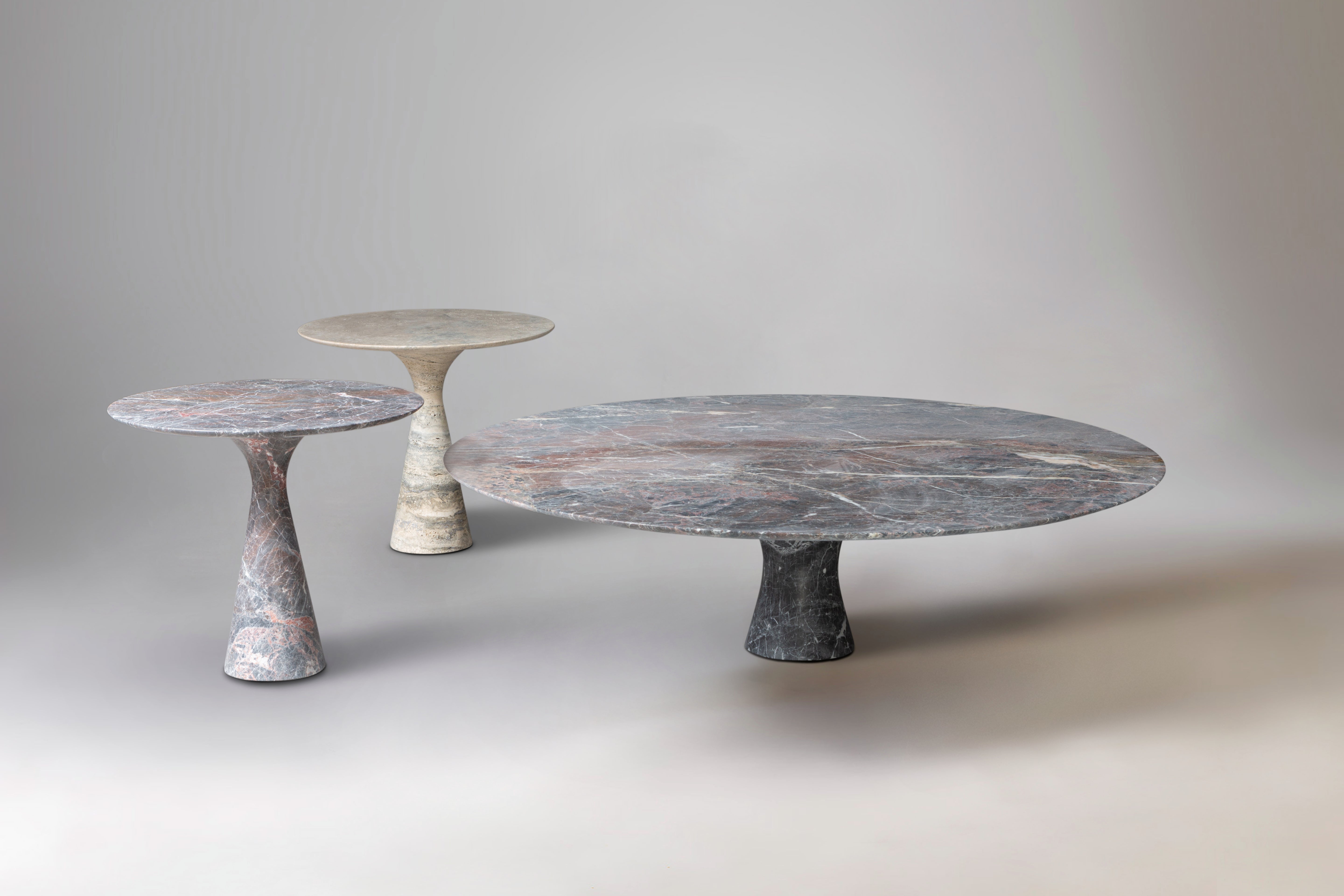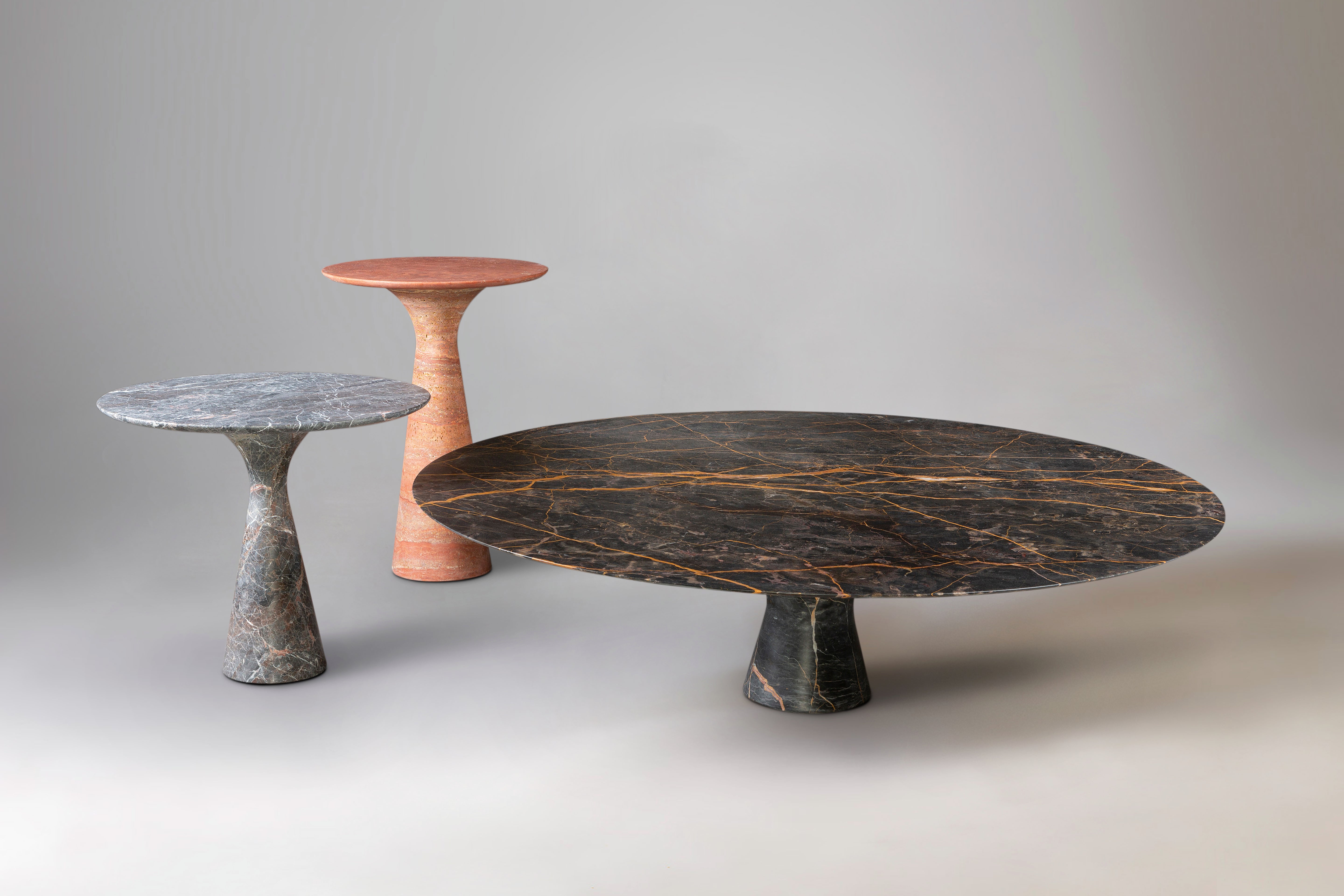 A family of side tables of different heights and dimensions that are perfect to combine. Two elements, table base and top, form one whole together. The bottom is one running curve from table foot to edge. The conical connection creates a stable whole.