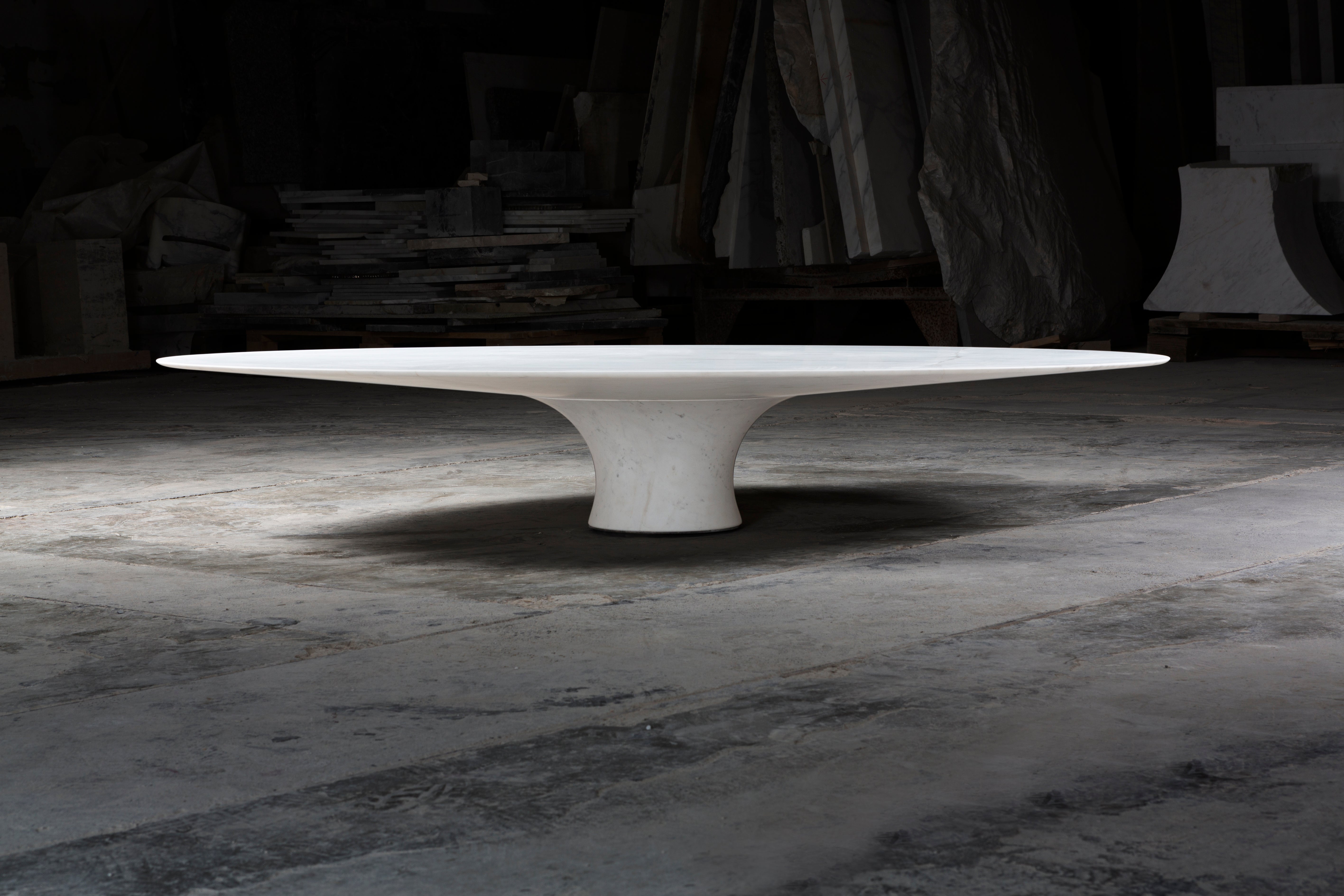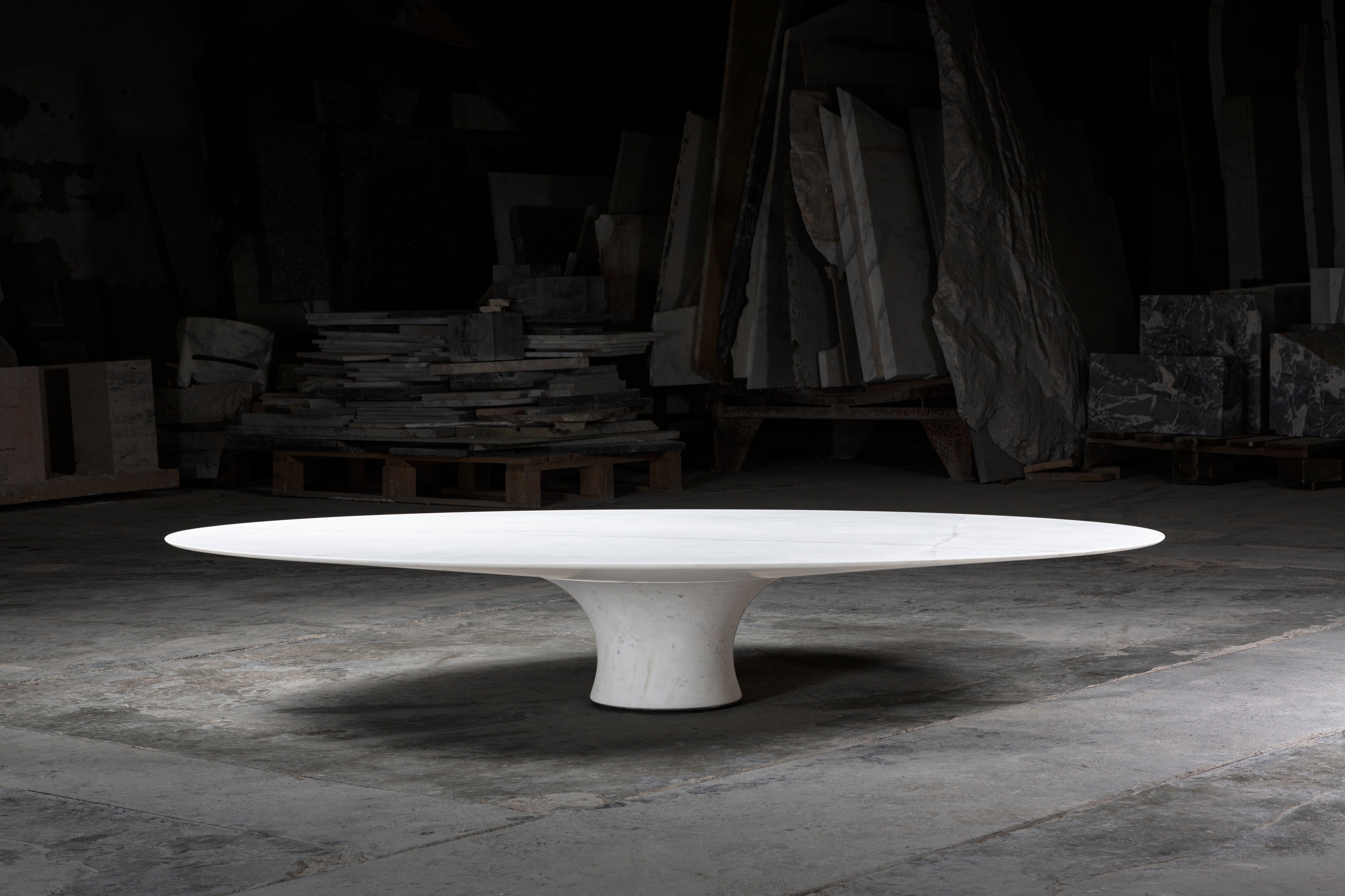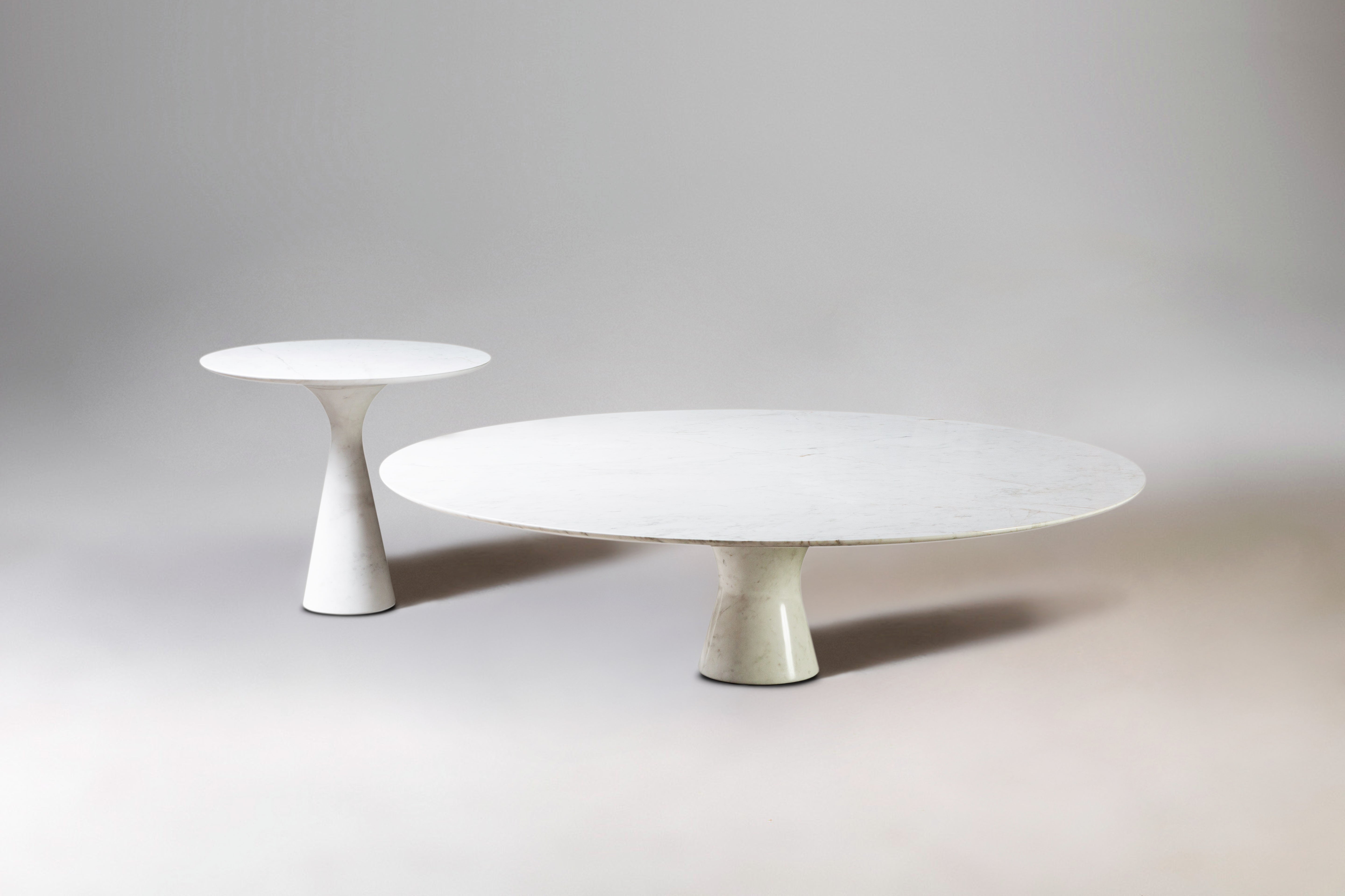 A family of side tables of different heights and dimensions that are perfect to combine. Two elements, table base and top, form one whole together. The bottom is one running curve from table foot to edge. The conical connection creates a stable whole.