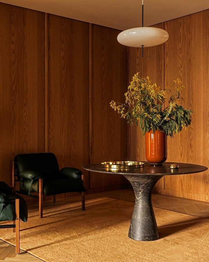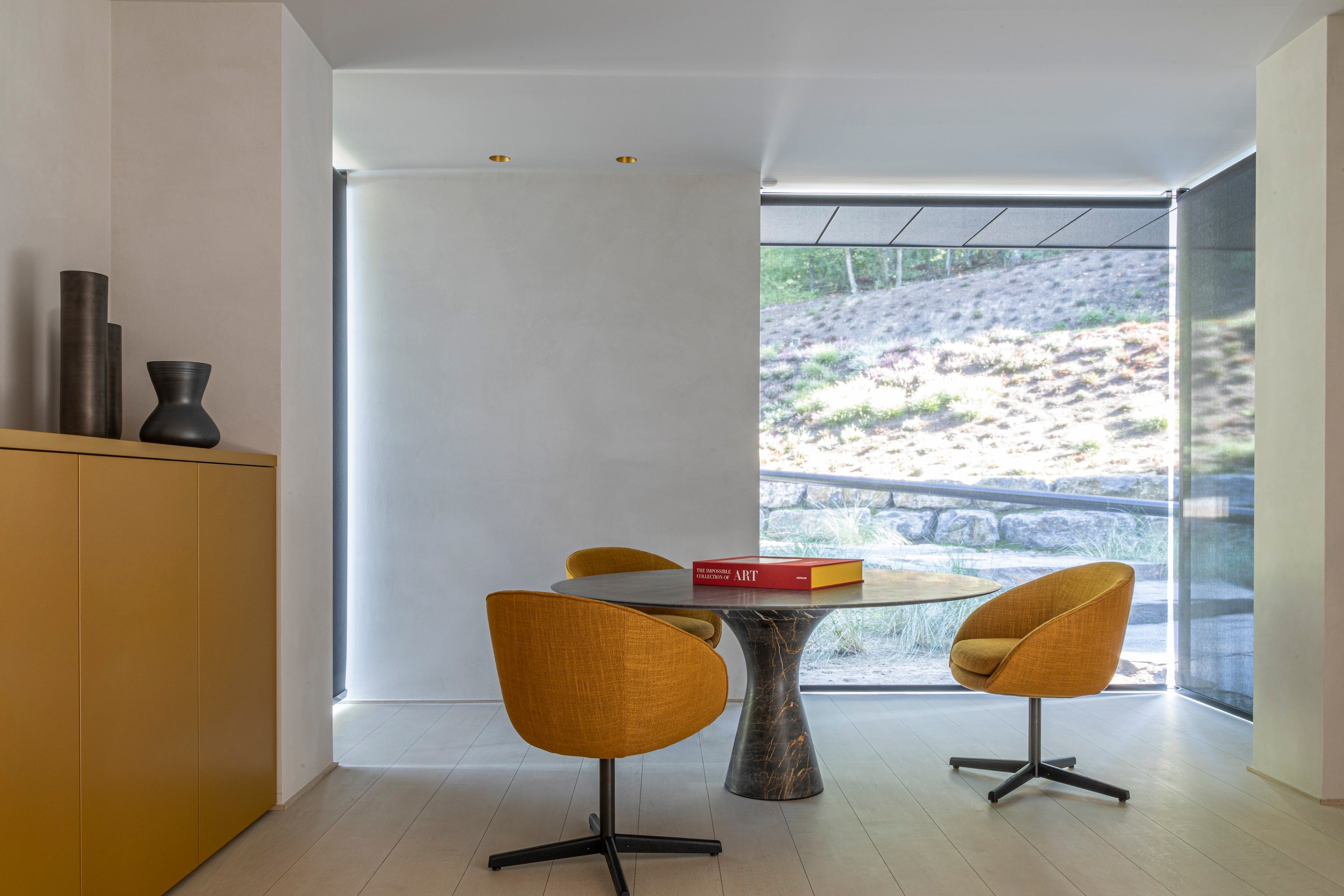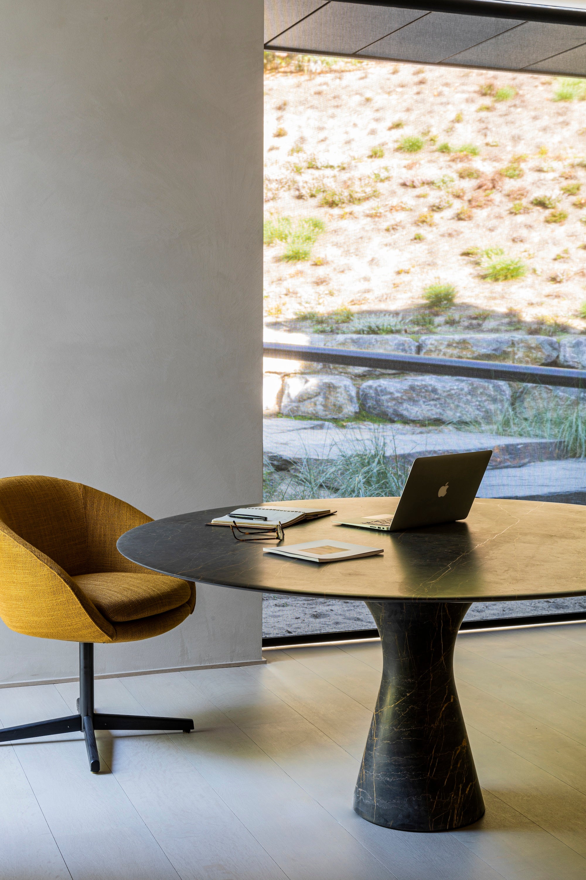 Angelo M is a timeless, sculptural round or oval table, available as a dining or side/coffee piece, crafted from natural stone. The seamless connection between the conical base and top creates a stable, continuous curve.