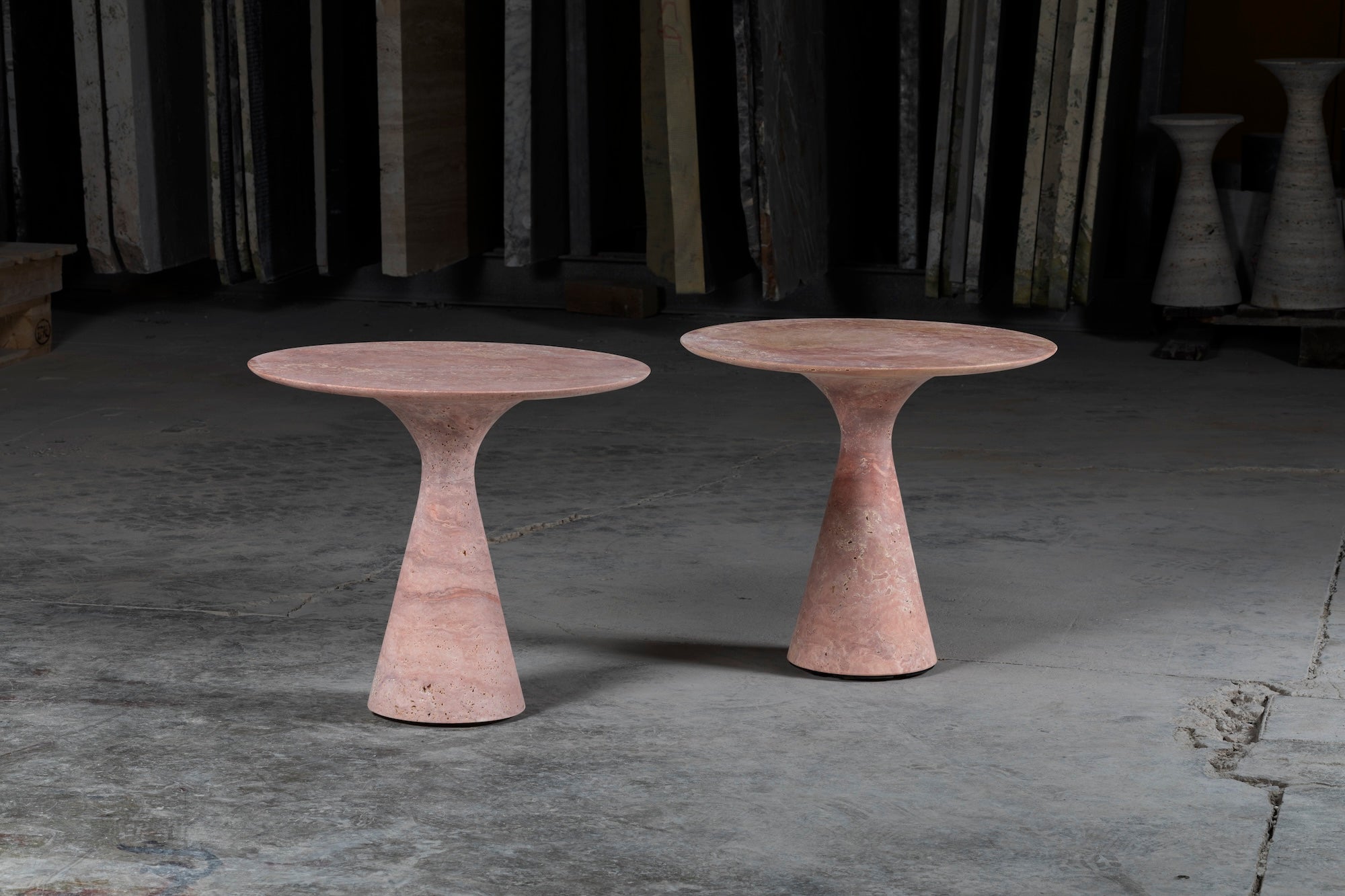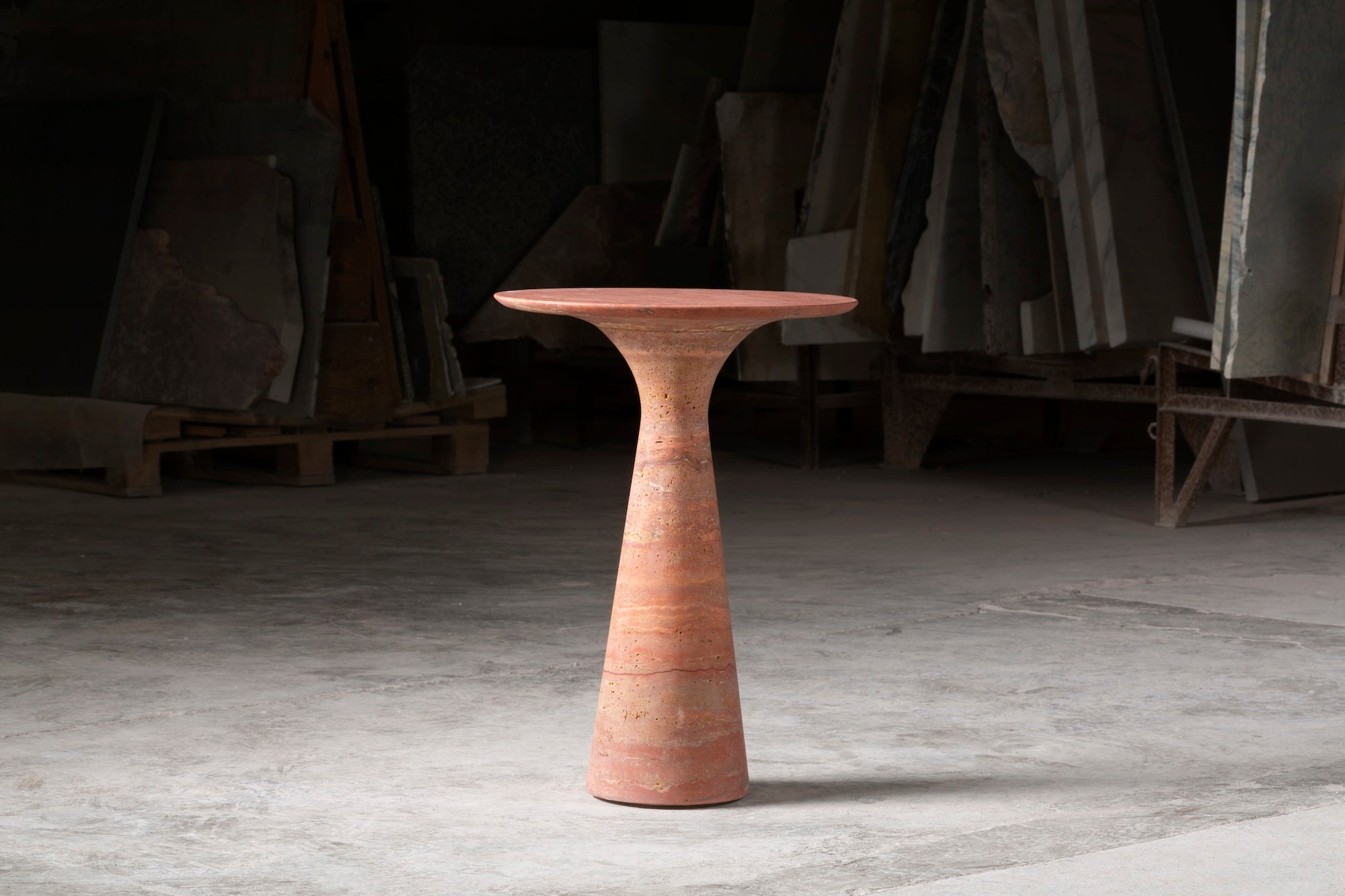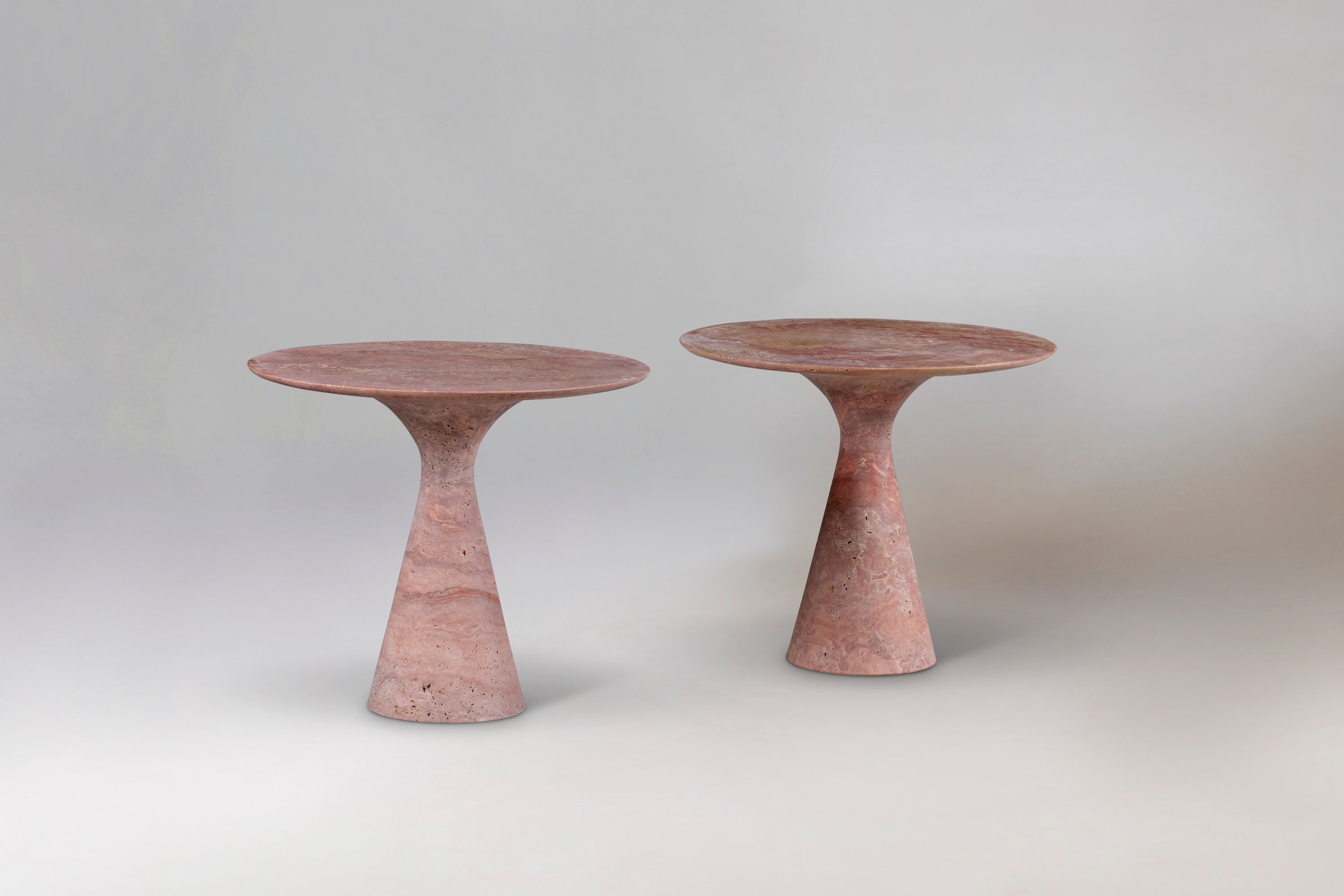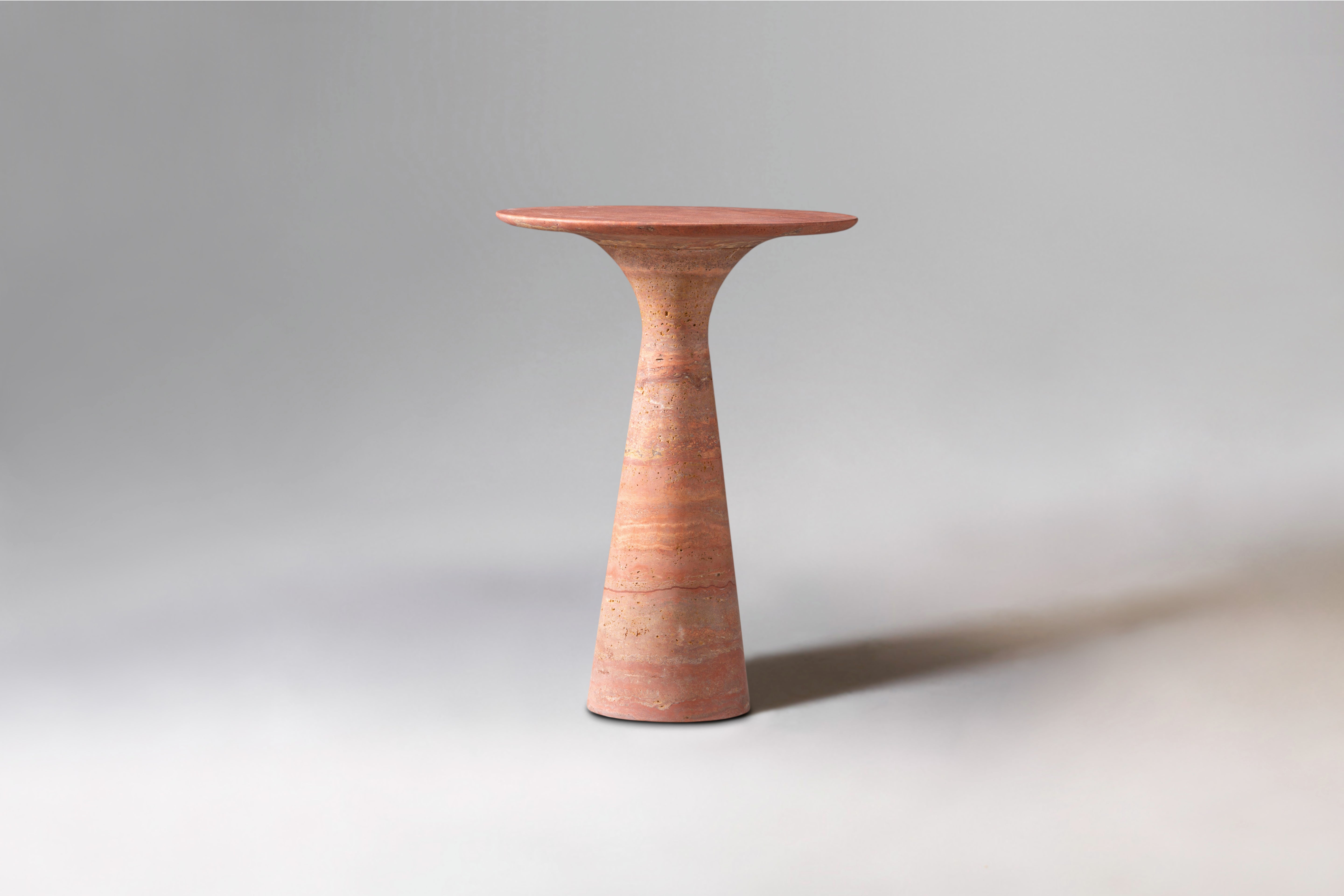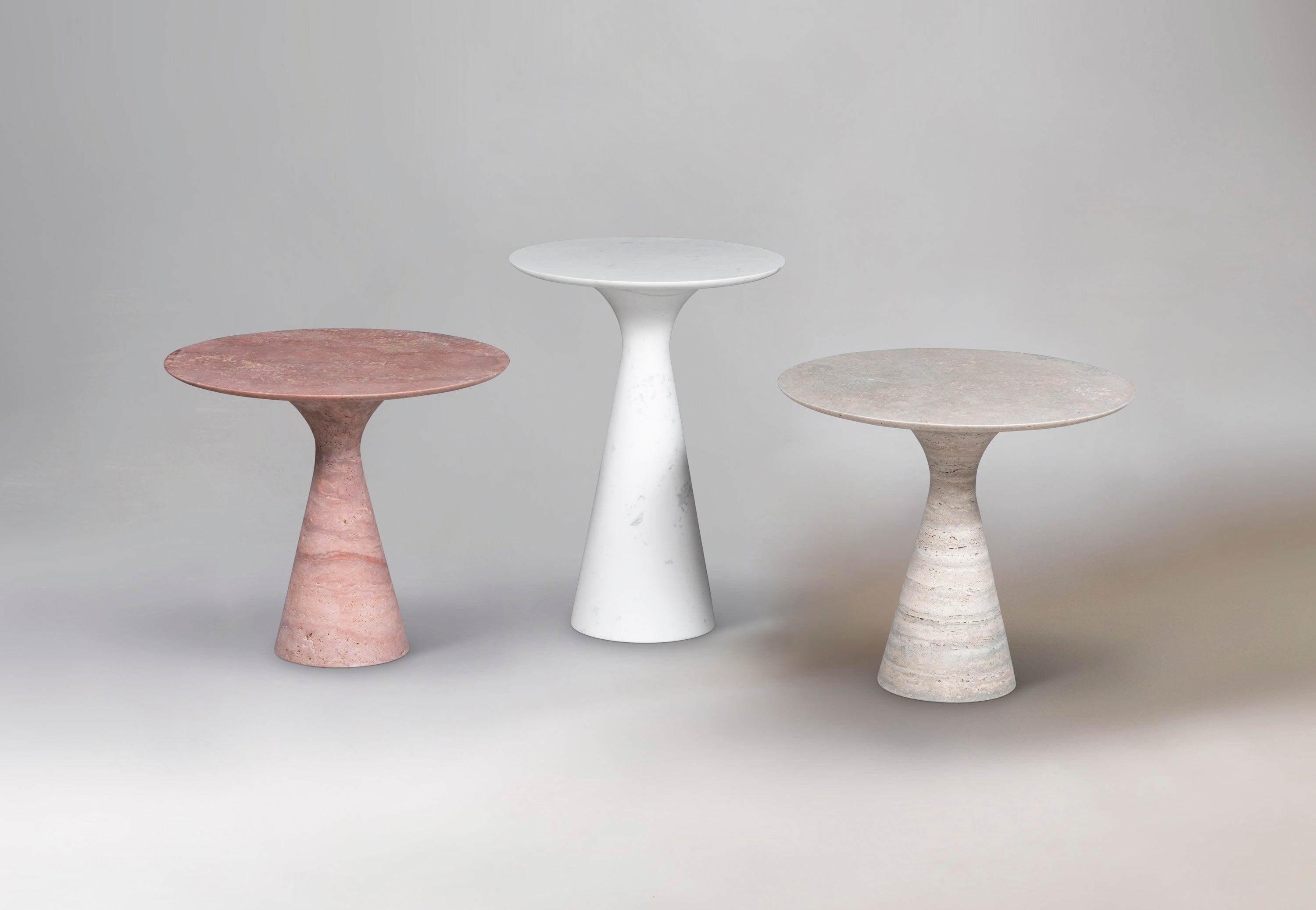 A family of side tables of different heights and dimensions that are perfect to combine. Two elements, table base and top, form one whole together. The bottom is one running curve from table foot to edge. The conical connection creates a stable whole.