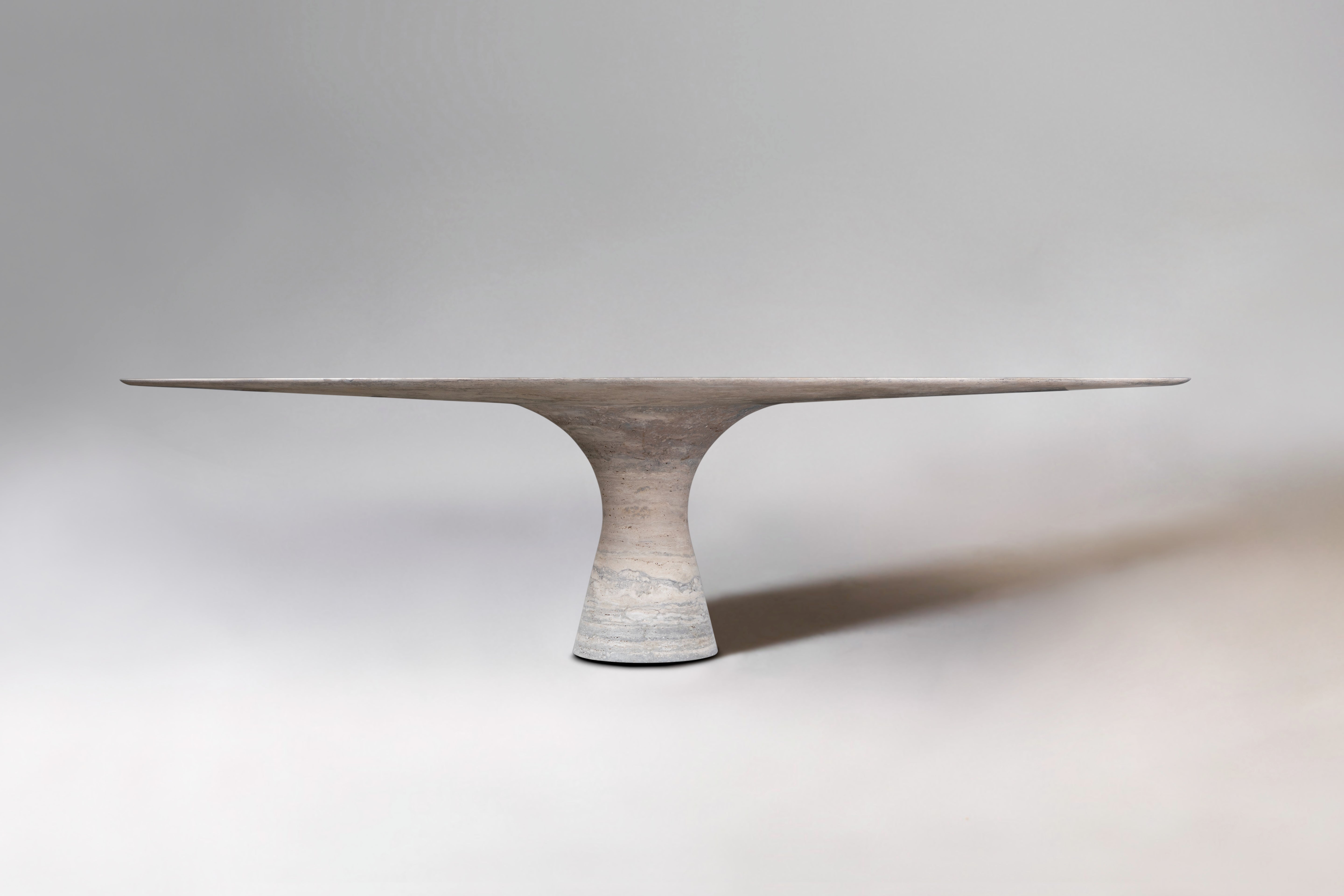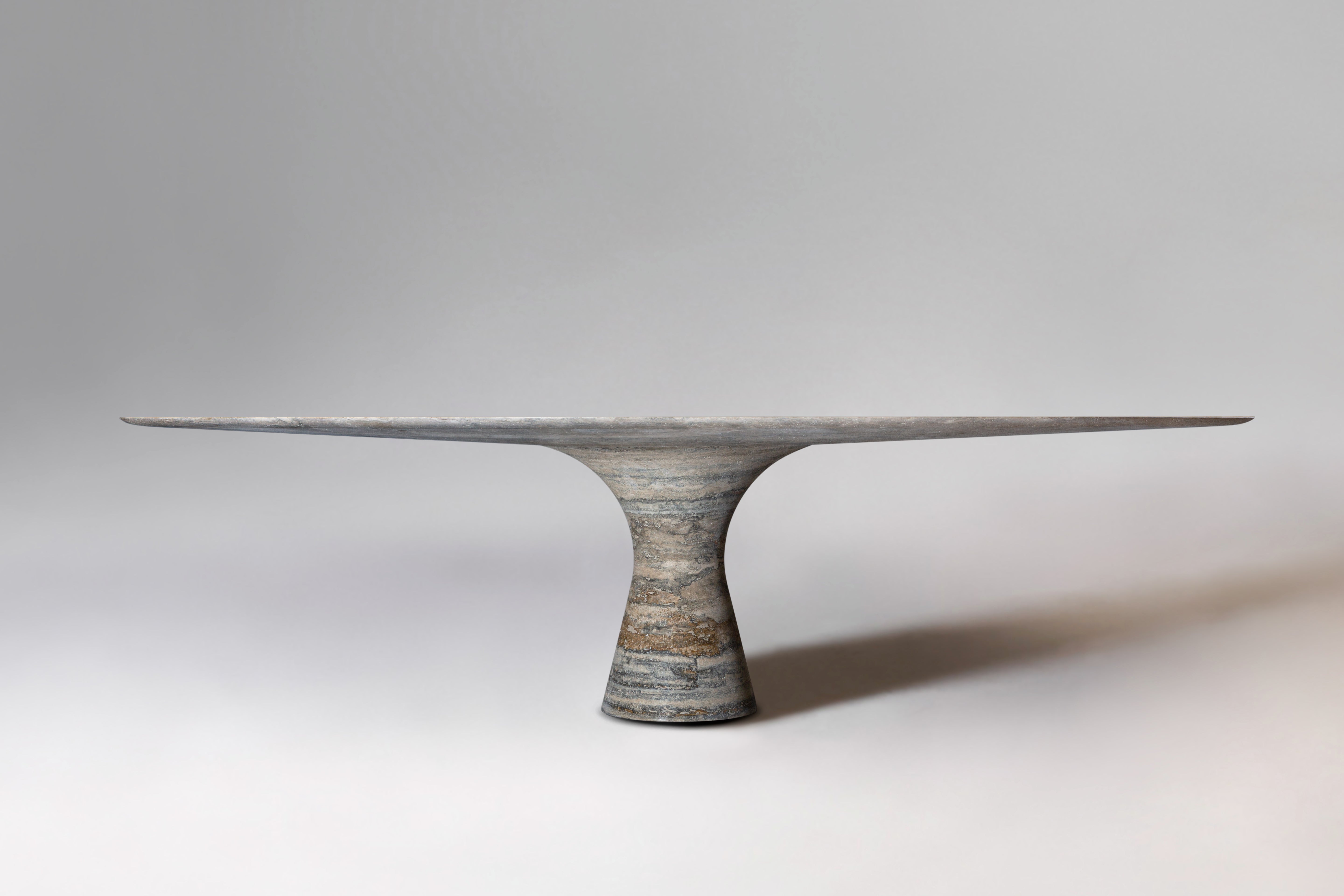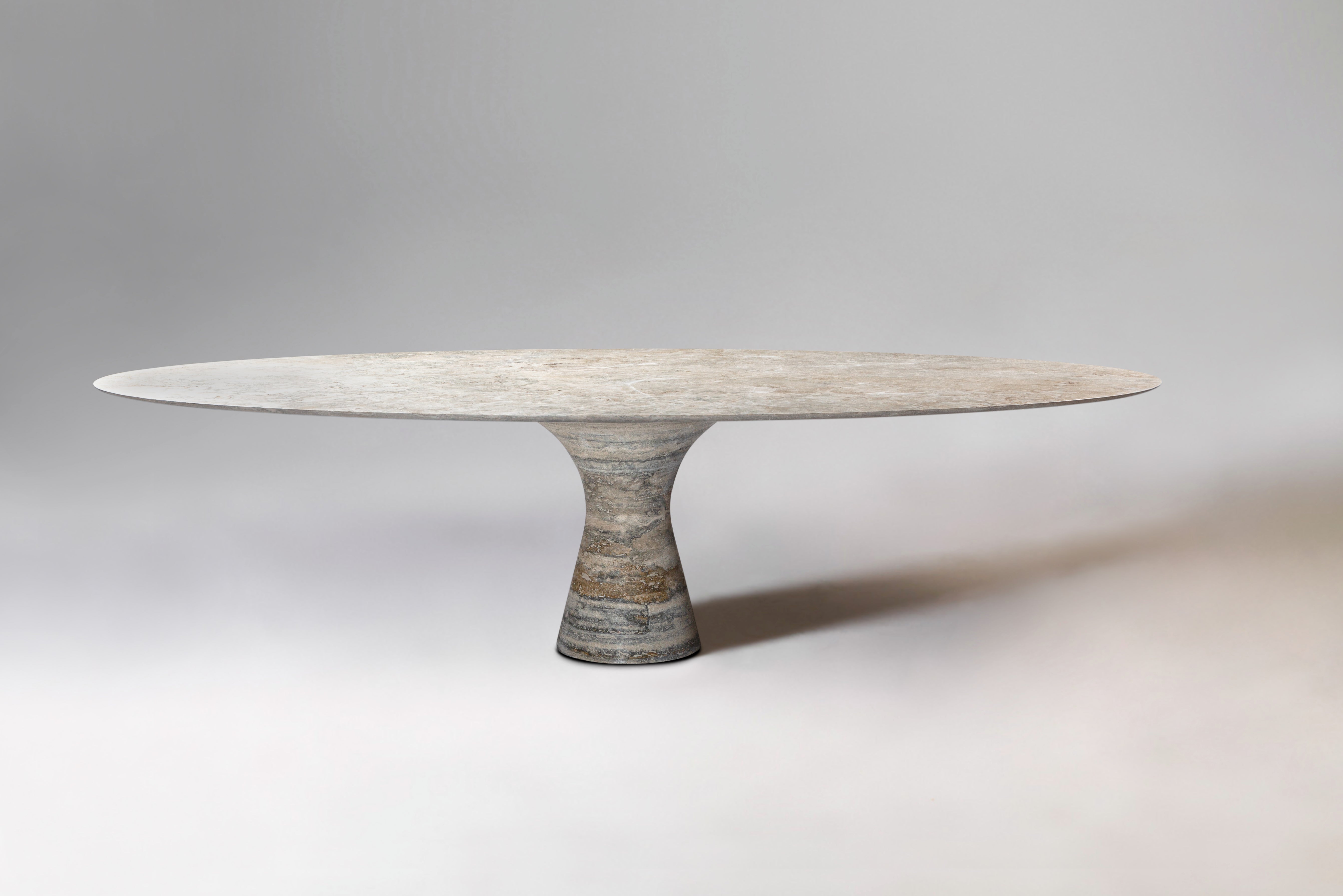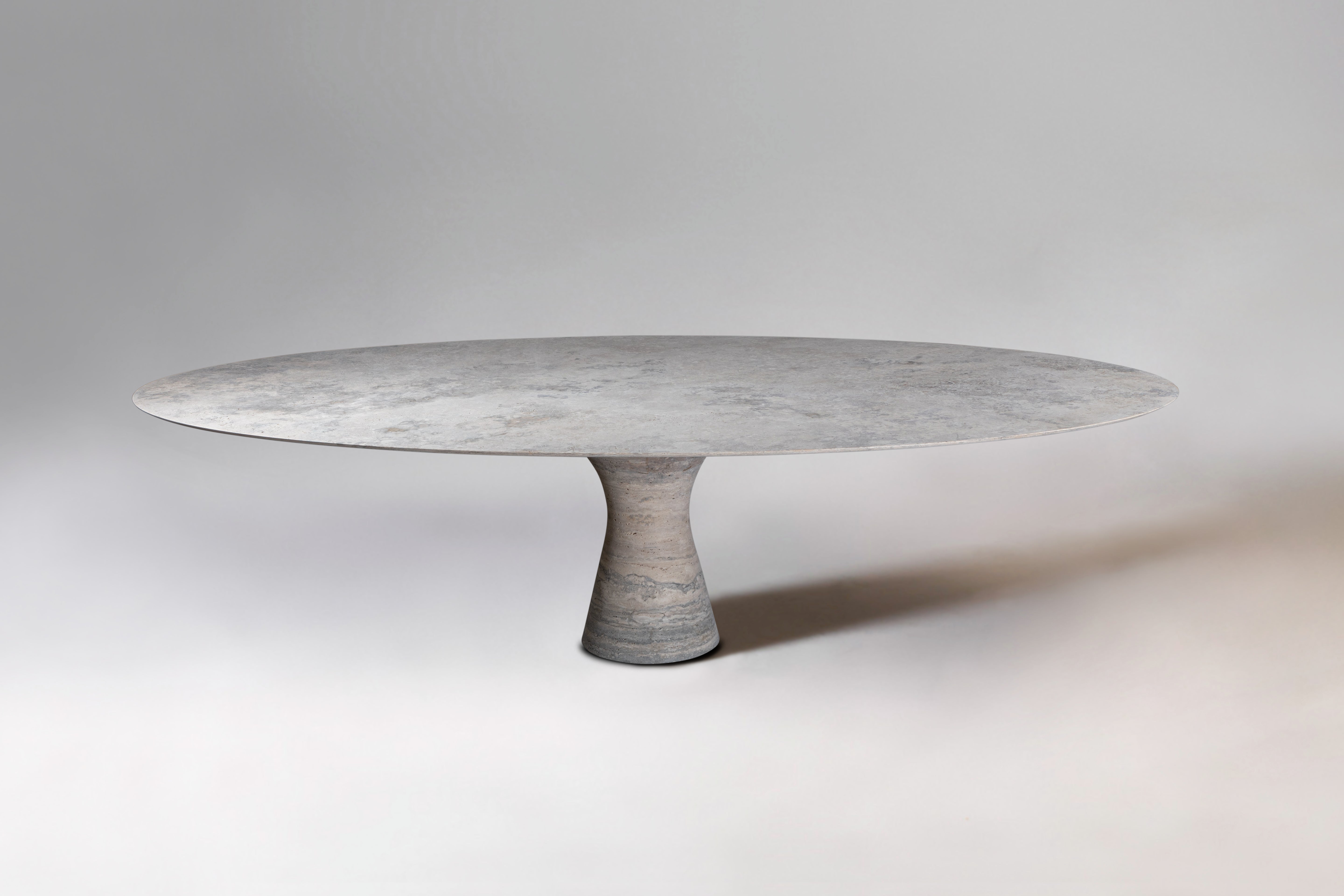 Angelo M is a timeless, sculptural round or oval table, available as a dining or side/coffee piece, crafted from natural stone. The seamless connection between the conical base and top creates a stable, continuous curve.
