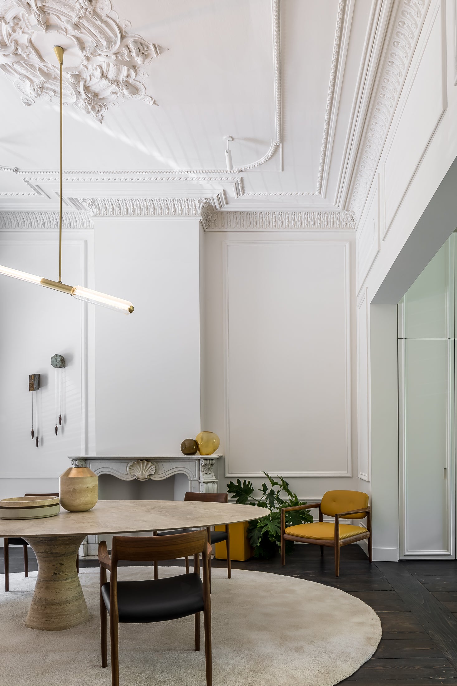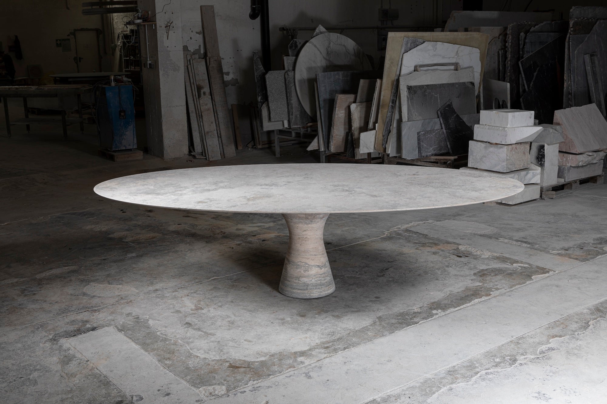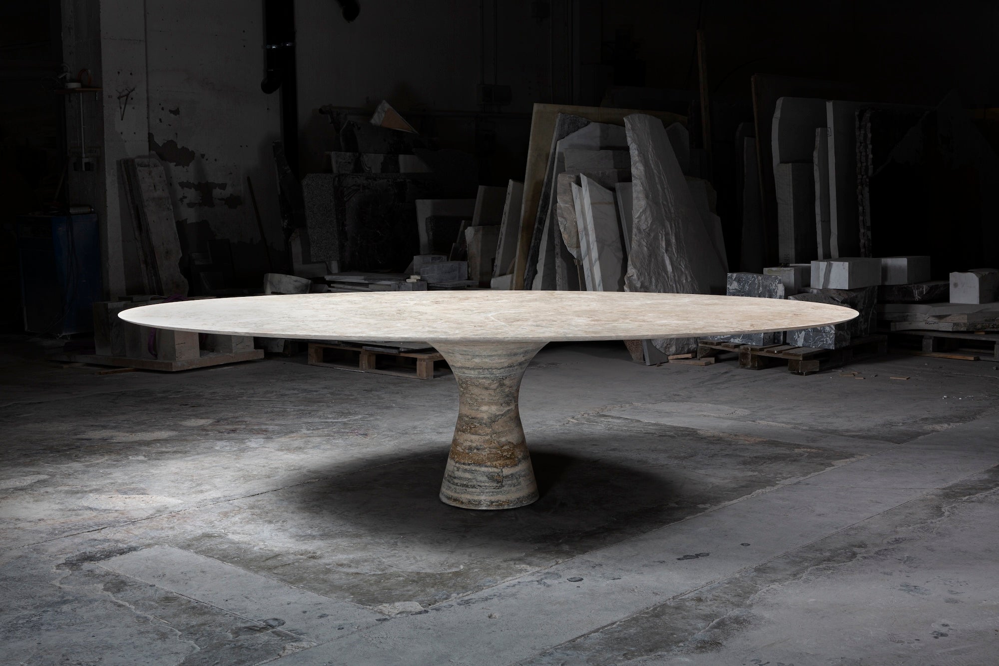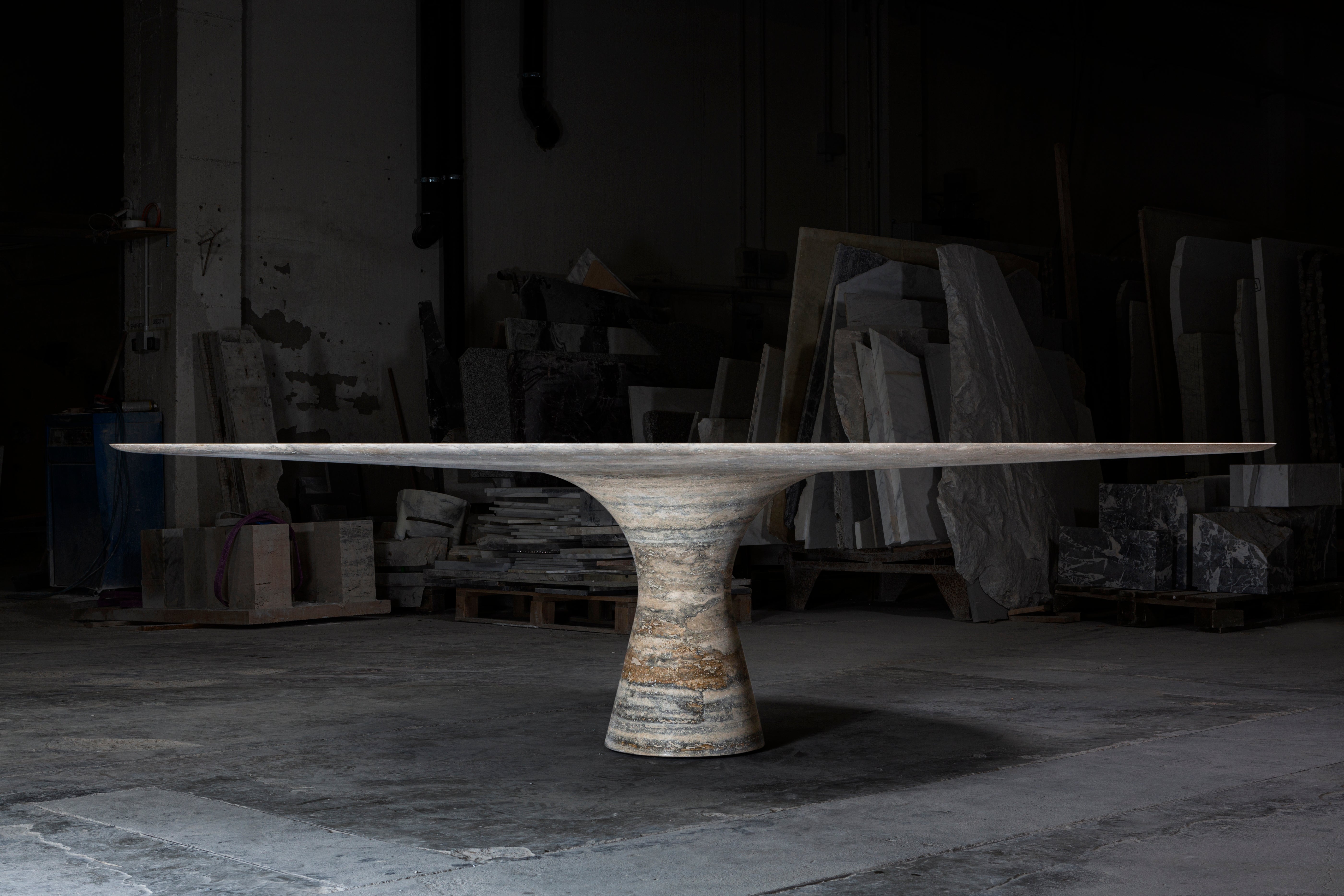 Angelo M is a timeless, sculptural round or oval table, available as a dining or side/coffee piece, crafted from natural stone. The seamless connection between the conical base and top creates a stable, continuous curve.