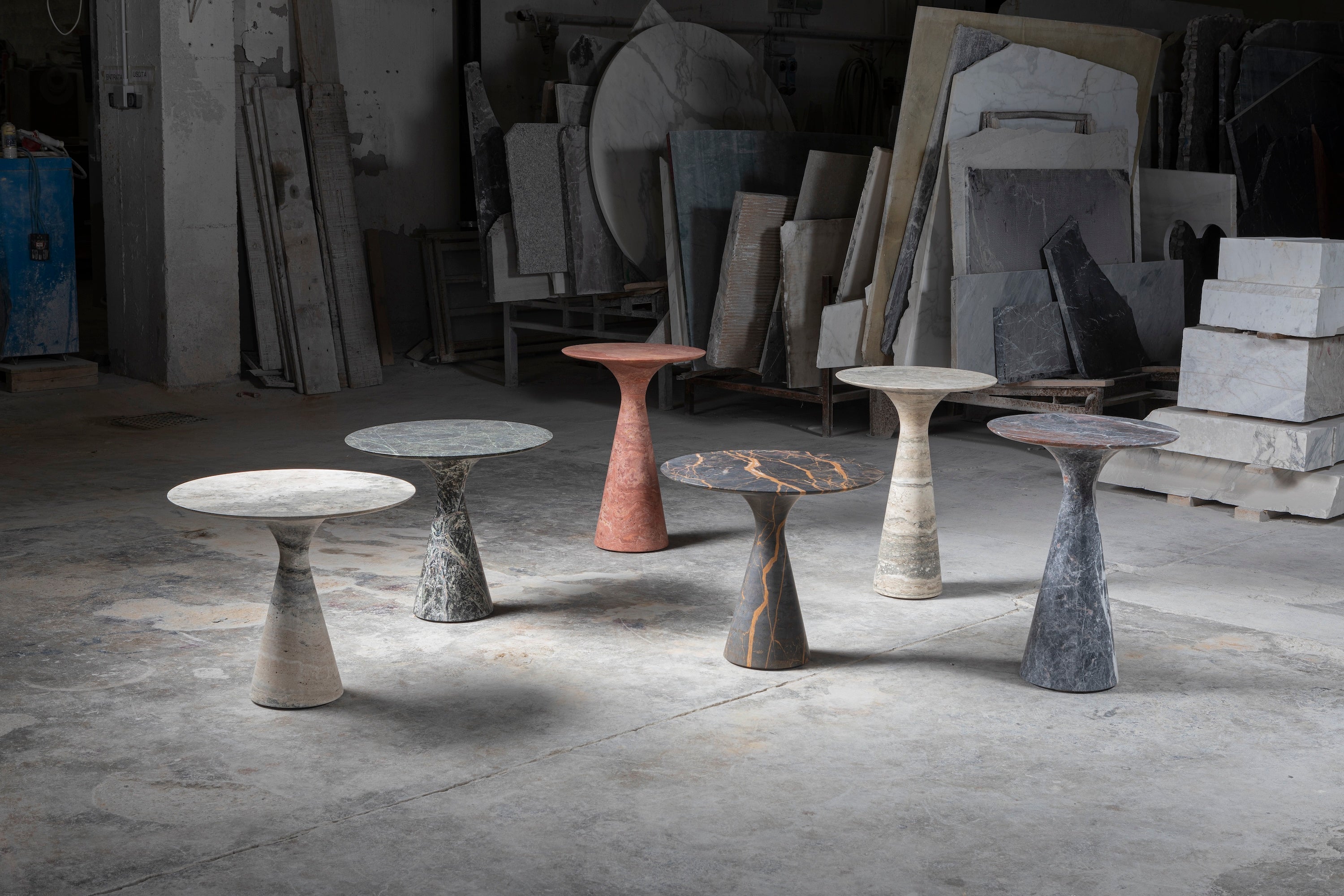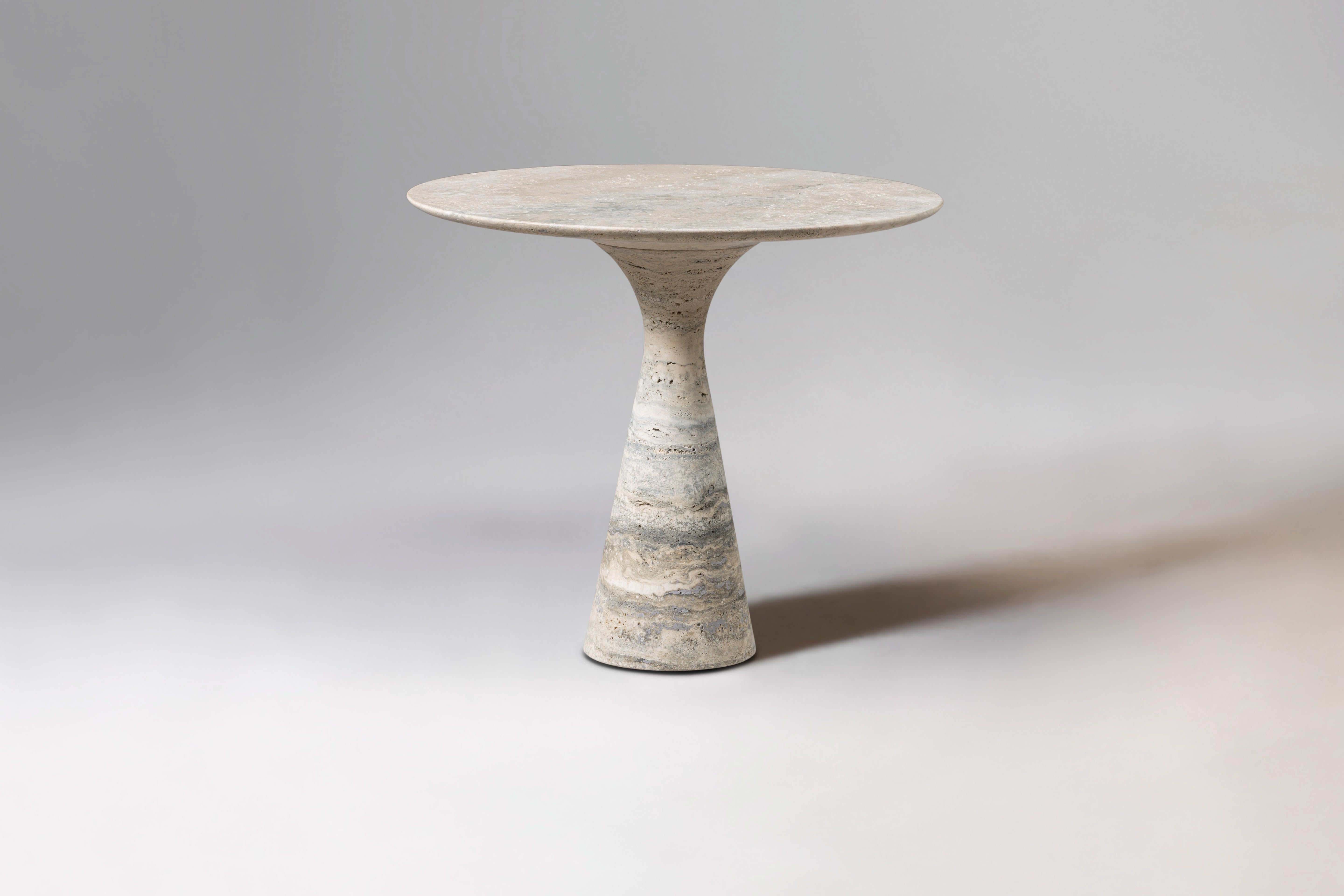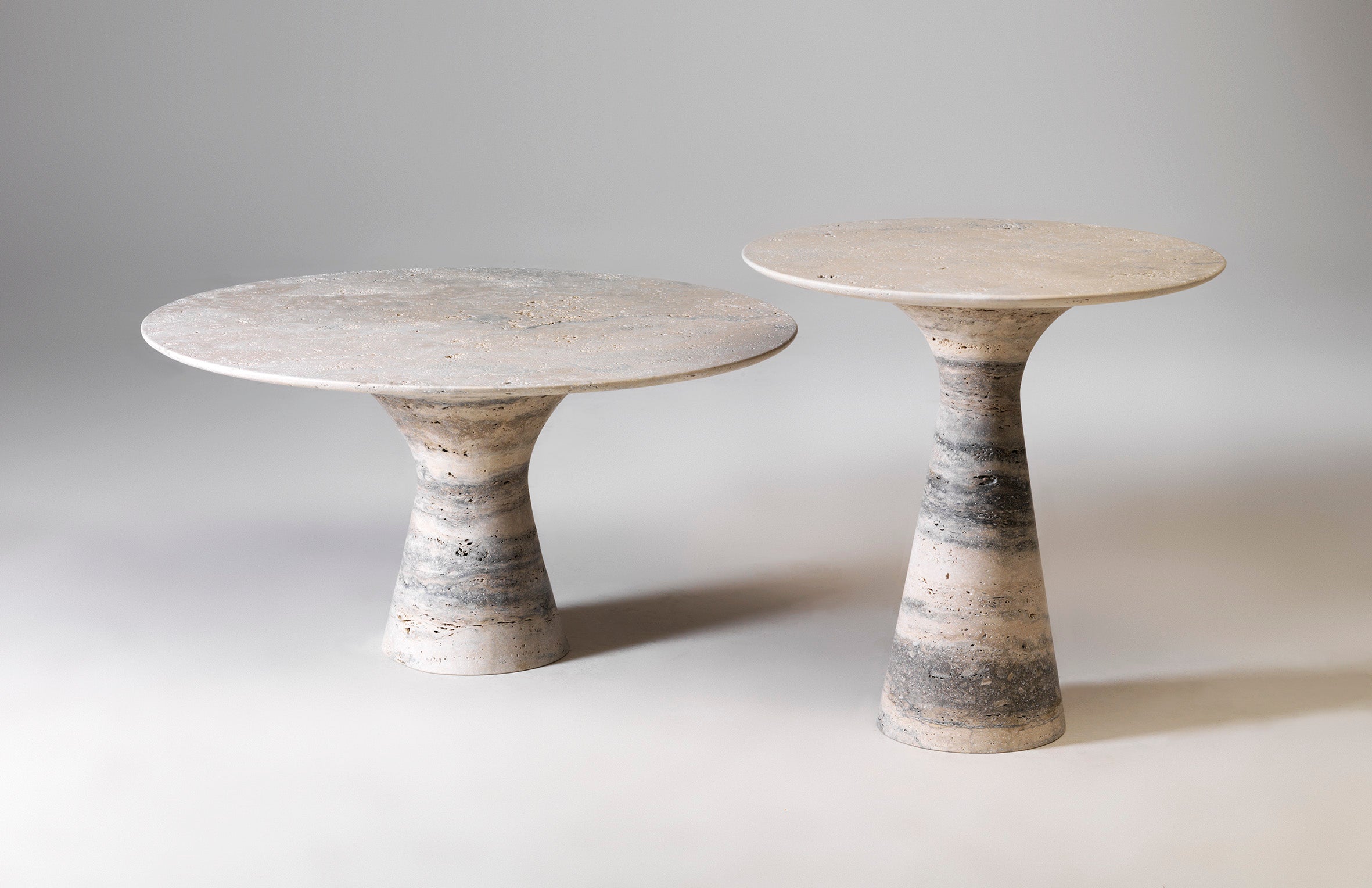A family of side tables of different heights and dimensions that are perfect to combine. Two elements, table base and top, form one whole together. The bottom is one running curve from table foot to edge. The conical connection creates a stable whole.